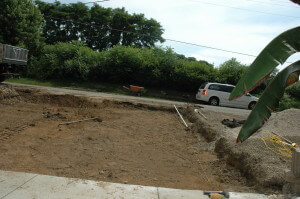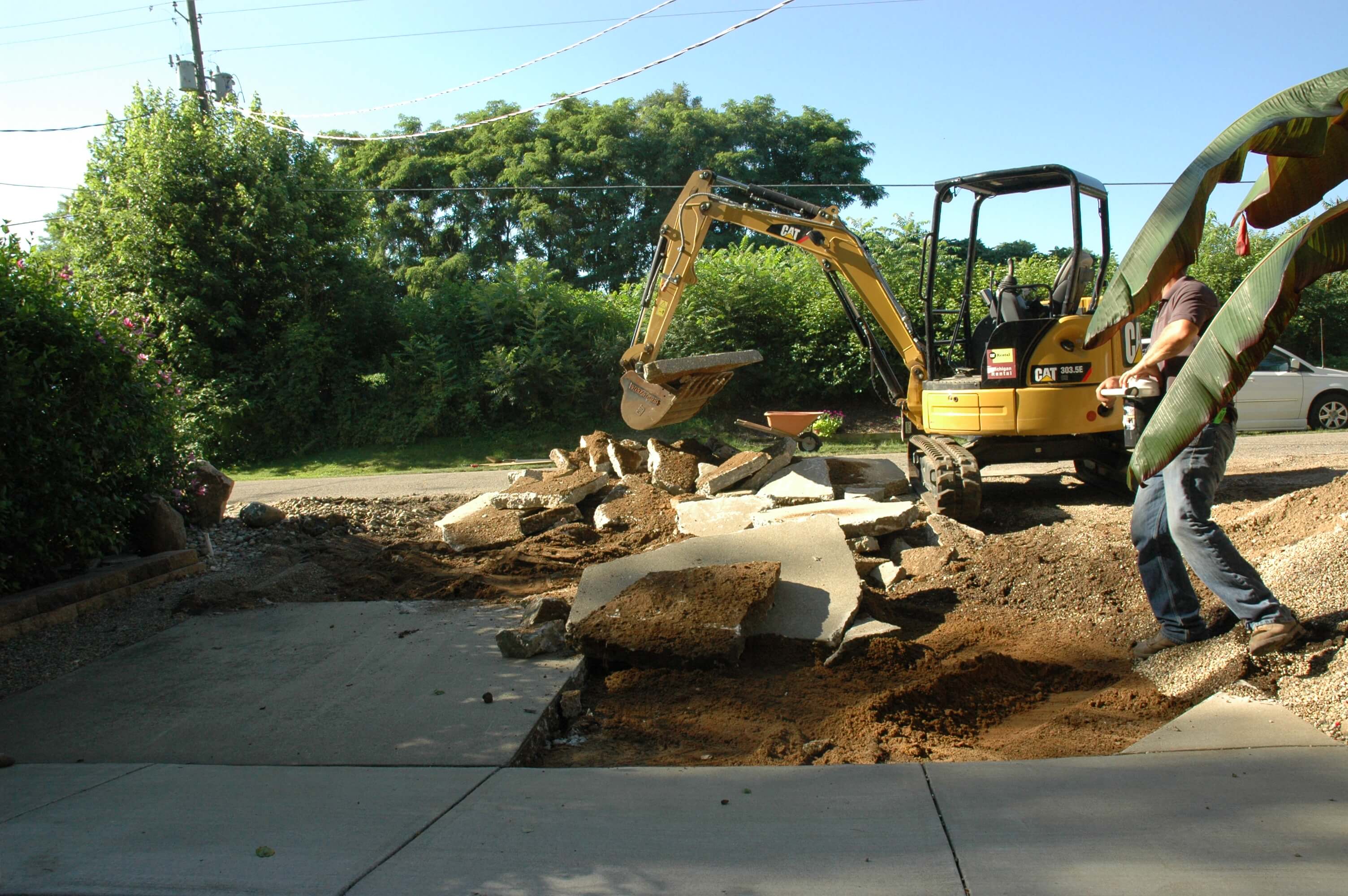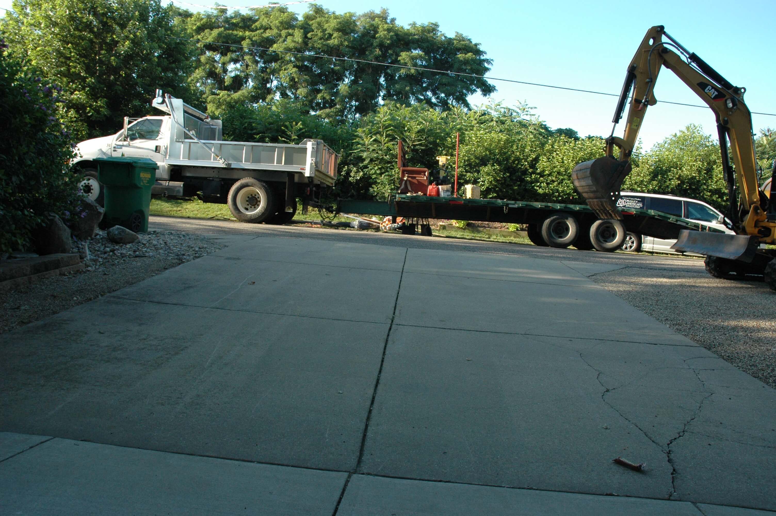 While is appears fairly straightforward, the project is a bit more complex than one might think. There needs to be a smooth transition from the road to the drive and the concrete apron at the garage slops over 3″ from right to left.